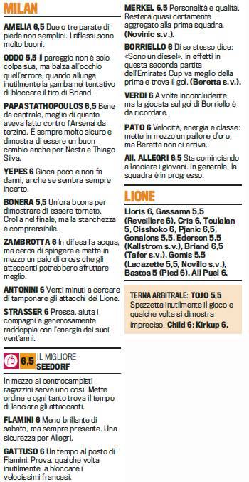 LONDRA (Inghilterra) – Nel secondo pareggio consecutivo nell’Emirates Cup, il Milan di Allegri, fermato sull’uno a uno dal Lione, può sorridere vista la prova del giovane centrocampista Merkel. Bene anche il greco Papastathopoulos nel ruolo di centrale e Seedorf a centrocampo, mentre Oddo è protagonista suo malgrado del pareggio dei francesi. Ecco i voti della Gazzetta dello Sport.