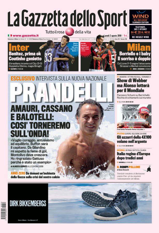 Sulla Gazzetta dello Sport intervista esclusiva con il nuovo c.t. della Nazionale italiana Cesare Prandelli che ha parlato della nuova Italia con il ritorno di Cassano, il debutto di Mario Balotelli e Amauri. Prandelli vuole un’Italia giovane e bella che sappia incantare e soprattutto conquistare il cuore dei tifosi.