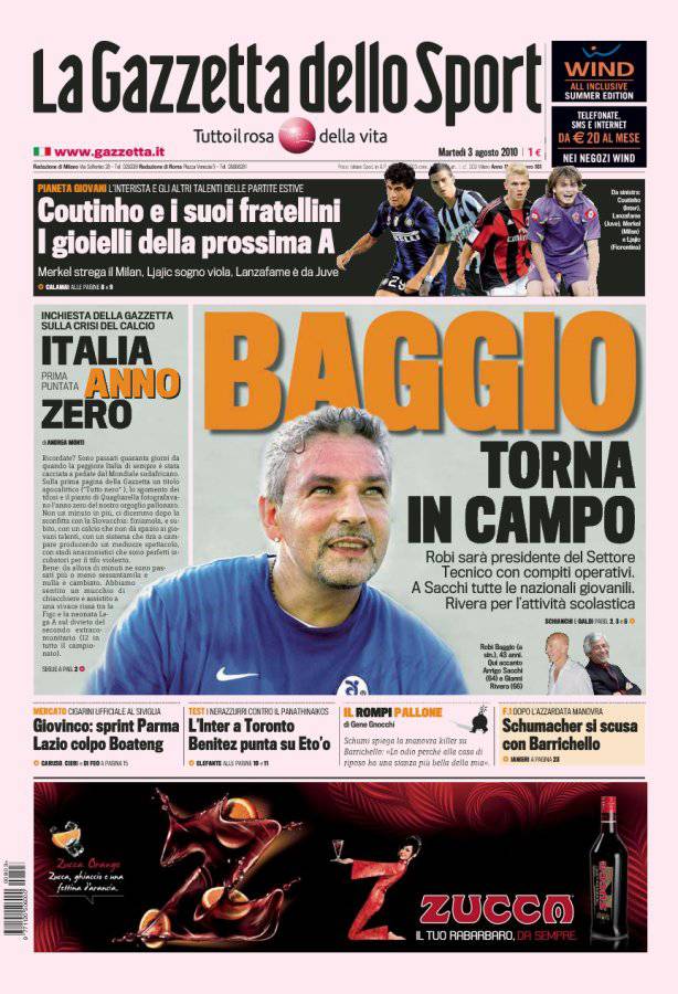 Sulla Gazzetta dello Sport si parla del ritorno di Roberto Baggio nel mondo del calcio. L’ex Divin Codino sarà il nuovo presidente del Settore Tecnico della Federazione italiana con compiti operativi. Il Responsabile di tutte le nazionali giovanili sarà Arrigo Sacchi mentre a Gianni Riversa verrà affidata l’attività scolastica.