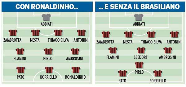 MILANO – Massimiliano Allegri ha già conquistato i giocatori del Milan. L’allenatore toscano ha provato più volte vari moduli, in particolare sta cercando di trovare una soluzione qualora Ronaldinho non dovesse essere presente a causa di qualche problema fisico. Con il brasiliano spazio al 4-3-3, senza il Gaucho rossonero verrà riproposto il 4-3-1-2 con Pirlo nel ruolo di trequartista. Ecco la foto ripresa dal Corriere dello Sport.