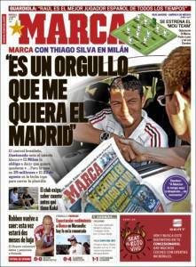 Sul quotidiano spagnolo Marca si parla dell’affare Real Madrid-Milan per Thiago Silva. Il brasiliano si è dichiarato molto orgoglioso dell’interesse del Real Madrid, infatti il club madrileno ha messo nel mirino il difensore centrale del Milan. Il brasiliano piace a Mourinho che lo vorrebbe come perno centrale della difesa delle “merengues”.