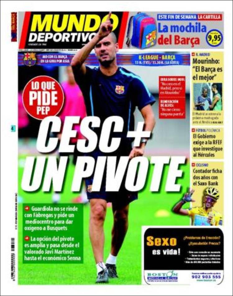Sul quotidiano Mundo Deportivo si parla del calciomercato Barcellona con il tecnico dei catalani Pep Guardiola che oltre all’acquisto di Cesc Fabregas vorrebbe un mediano alto in grado di far rifiatare lo spagnolo Busquets. Per l’acquisto di Fabregas sono giorni importanti visto che il Barcellona e l’Arsenal continuano a trattare.