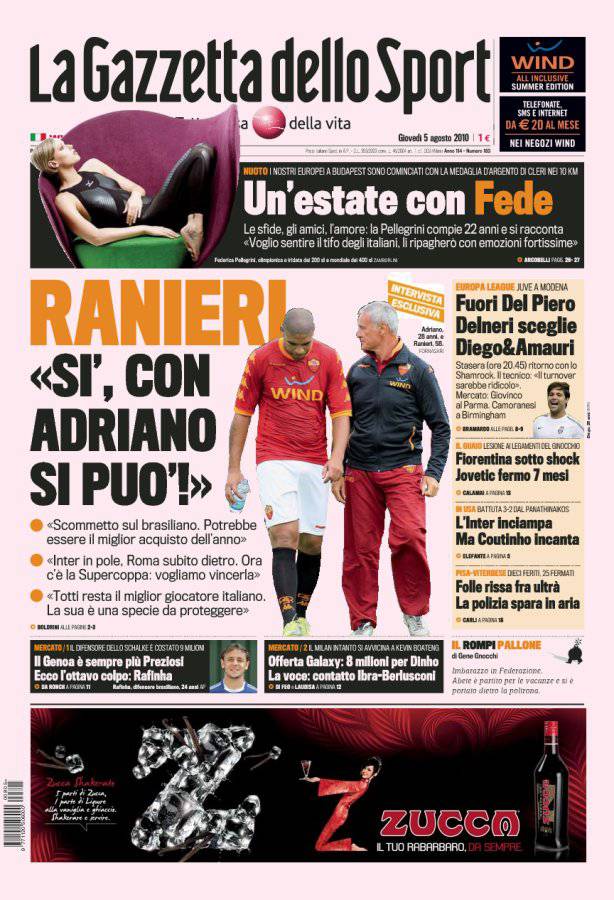 Sulla Gazzetta dello Sport intervista esclusiva al tecnico della Roma Claudio Ranieri che ha parlato del campionato e di Adriano. L’allenatore romano scommette sul brasiliano e sulla sua Roma che ha voglia di iniziare a vincere già nella Supercoppa Italiana contro l’Inter. In campionato vede i nerazzurri leggermente favoriti.