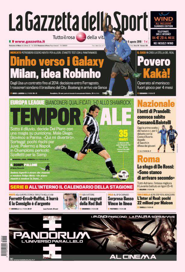 Sulla Gazzetta dello Sport si parla del match di ieri sera tra Juventus e Shamrock Rovers nel ritorno dei preliminari di Europa League che ha visto i bianconeri vincere uno a zero grazie al gol di Alessandro Del Piero su punizione da 35 metri.