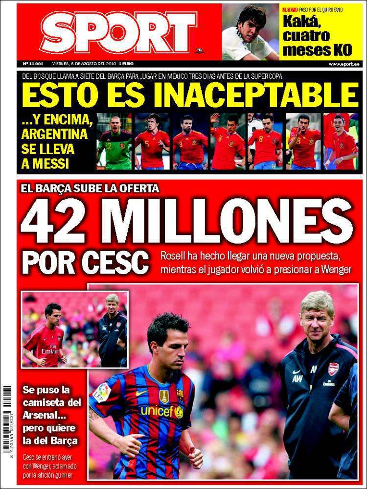 Sul quotidiano catalano Sport si parla dell’operazione Fabregas, con il Barcellona che ha offerto 42 milioni di euro per il centrocampista spagnolo. L’Arsenal per il momento non intende privarsi del giocatore, anche se il diretto interessato ha più volte ribadito l’intenzione di giocare nel Barcellona.