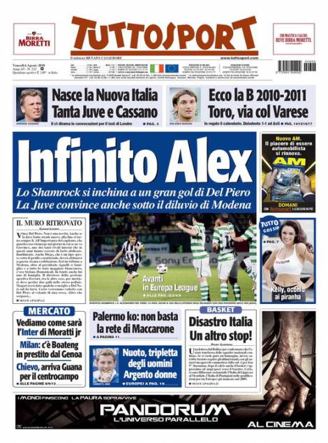 Anche il quotidiano torinese Tuttosport parla della magia su punizione di Alessandro Del Piero che ha permesso alla Juventus di vincere uno a zero nel match contro lo Shamrock Rovers nel ritorno dei preliminari di Europa League. Ancora una volta la bandiera bianconera ha dimostrato di essere un giocatore di grande classe.