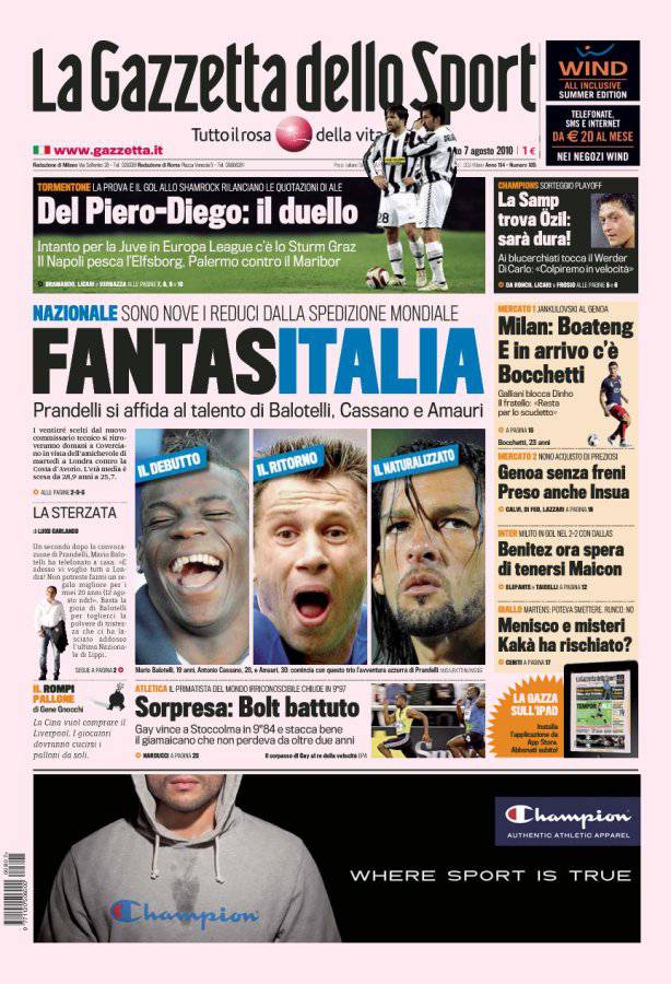 La Gazzetta dello Sport apre il proprio giornale con le convocazioni del nuovo c.t. dell’Italia Cesare Prandelli in vista dell’amichevole contro la Costa d’Avorio. L’ex tecnico della Fiorentina ha riportato in Nazionale Antonio Cassano, ci sarà il debutto di Amauri e soprattutto quello di Balotelli.