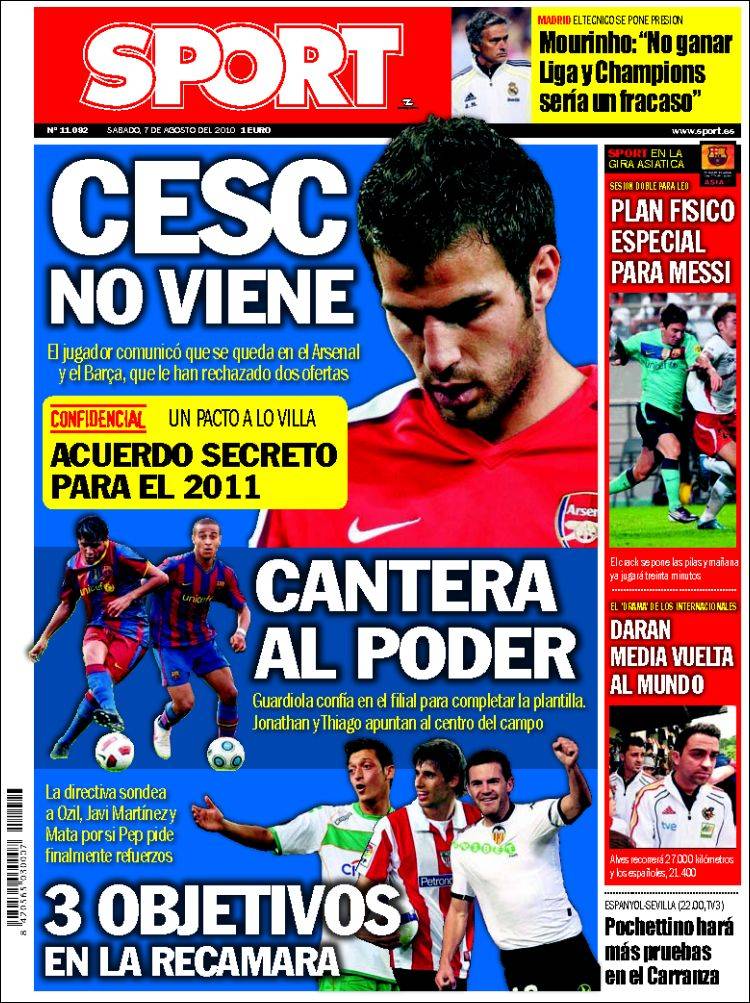 Ieri il centrocampista spagnolo dell’Arsenal Cesc Fabregas ha dichiarato la sua intenzione di continuare a giocare nei “Gunners” visto che il manager Wenger non ha nessuna intenzione di cedere alle offerte del Barcellona. Oggi l’altro quotidiano catalano Sport parla di un accordo segreto tra i due club per il 2011.