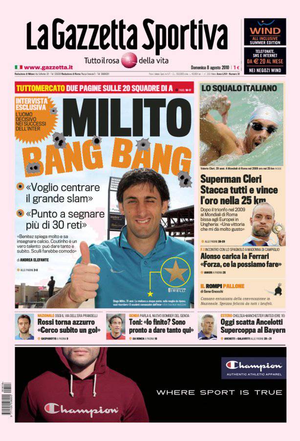MILANO – In un’intervista esclusiva al quotidiano milanese, il bomber argentino Diego Milito ha parlato dei suoi obiettivi per la prossima stagione che per l’Inter avrà inizio il 21 agosto con la finale di Supercoppa Italiana contro la Roma. L’attaccante ex Genoa ha dichiarato di voler segnare più di 30 anni e di voler fare il ‘Grande Slam’, quest’anno l’Inter sarà impegnata in tre finali sicuramente: Supercoppa Italia ed euoropea ed infine anche il Mondiale per club.