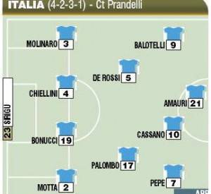 LONDRA (Inghilterra) – Il nuovo c.t. dell’Italia Cesare Prandelli ha sciolto il dubbio: giocherà Balotelli dal primo minuto con Quagliarella che partirà dalla panchina. In attacco la punta Amauri verrà supportata dai tre trequartisti Balotelli-Cassano-Pepe. Ecco la formazione degli azzurri riportata dal Corriere dello Sport.