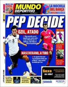 BARCELLONA (Spagna) – Il quotidiano catalano parla del mercato del Barça. Guardiola, messo praticamente a segno il colpo Ozil, deve decidere se aprire una trattativa con il Liverpool per Mascherano, oggetto dei desideri dell’Inter di Moratti.