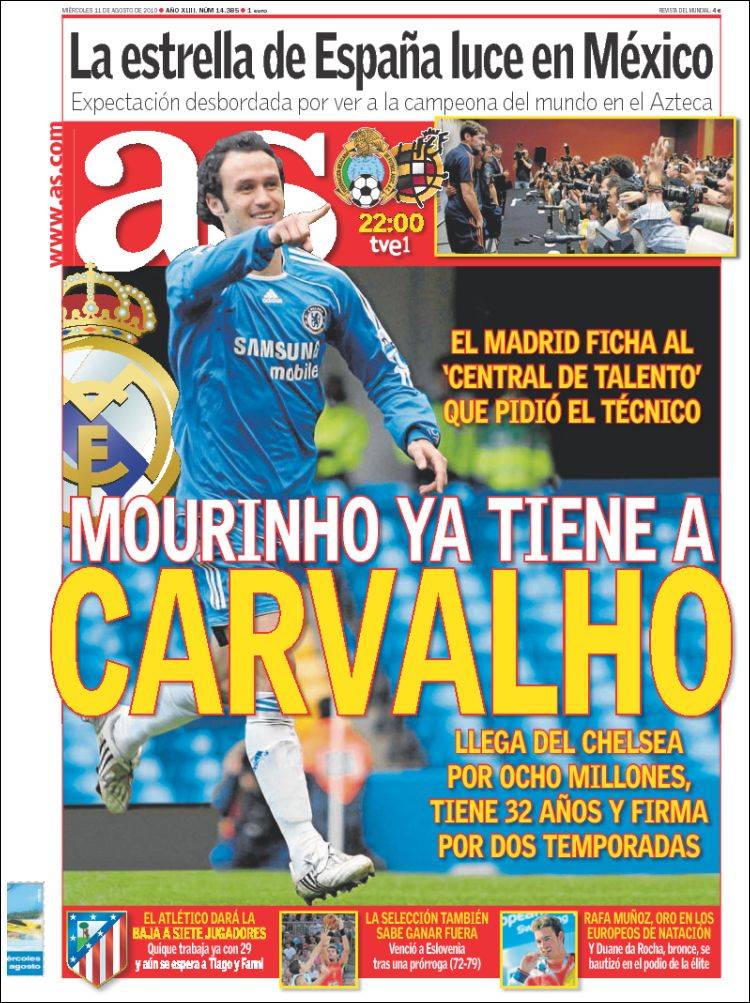 Sul quotidiano madrileno As si parla del calciomercato del Real Madrid ed in particolare dell’acquisto di Ricardo Carvalho da parte dei madrileni. Il portoghese ha 32 anni ed è stato acquistato dal Chelsea, è uno dei pupilli dello Special One. Carvalho ha firmato un contratto di due anni con le “merengues”.