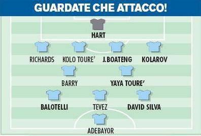 MANCHESTER (Inghilterra) – Il Corriere dello Sport ha realizzato una formazione per il Manchester City ipotizzando la squadra titolare che metterà in campo Roberto Mancini, in neretto sono segnati i nuovi acquisti e sei giocatori su undici vale a dire 6/11 della formazione è nuova nel senso che sono giocatori appena acquistati. Nell’11 c’è anche Mario Balotelli, ecco a voi che squadra ma soprattutto che bell’attacco che si ritroverà il Mancio.