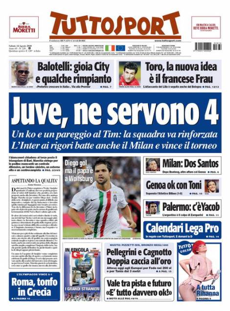 Sul quotidiano torinese Tuttosport si parla del calciomercato Juventus con i bianconeri che dovrebbero rinforzarsi maggiormente visto che ieri nel Trofeo Tim è sembrata una squadra ancora al di sotto del livello dell’Inter di Benitez. Intanto Diego potrebbe restare visto che a Delneri il brasiliano è piaciuto molto.