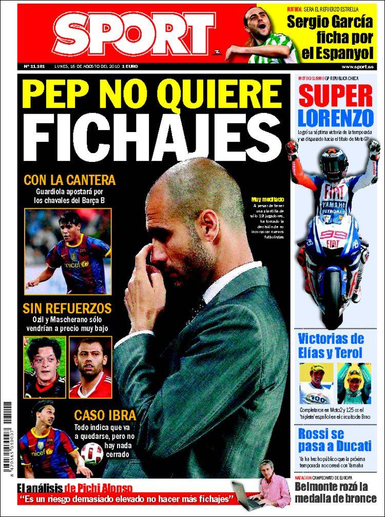 Il quotidiano catalano Sport parla della debacle del Barcellona nell’andata della finale di Supercoppa di Spagna persa dai catalani per tre a uno contro il Siviglia. Guardiola non vuole rinforzi per il suo Barcellona, anche se la società starebbe cercando di acquistare uno tra Ozil e Mascherano.