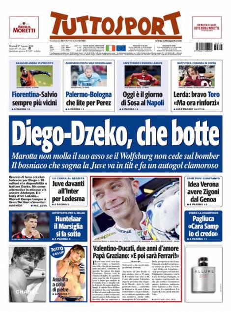 Sul quotidiano Tuttosport si parla del calciomercato della Juventus ed in particolare di Dzeko e Diego. Con il Wolfsburg è guerra aperta, visto che il club tedesco non molla il centravanti bosniaco, mentre i bianconeri non vogliono cedere Diego al Wolfsburg.