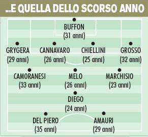 Calciomercato Juventus – TORINO – Con l’arrivo di Marotta e Delneri, ed in particolare con la nomina a presidente della Juventus di Andrea Agnelli, la nuova politica di mercato dei bianconeri è cambiata. Oggi il Corriere dello Sport ha riportato la formazione bianconera della scorsa stagione e quella di oggi. Nel primo caso l’età media era abbastanza alta (anche se nella foto a Cannavaro vengono tolti erroneamente circa 10 anni), mentre nella seconda formazione si vede il netto miglioramento generazionale.