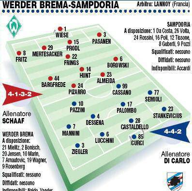 BREMA (Germania) – Questa sera la Sampdoria affronterà a Brema il Werder nell’andata dei preliminari di Champions League. Il tecnico dei blucerchiati Mimmo Di Carlo si affida alla coppia d’attacco Pazzini-Cassano. Nel Werder non c’è Ozil passato ufficialmente al Real Madrid. Ecco le formazioni secondo Tuttosport.