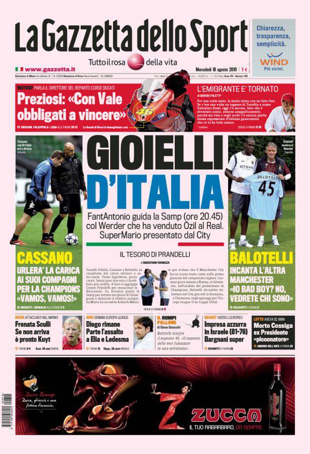 La Gazzetta dello Sport apre dedicando il titolo ad Antonio Cassano, che questa dovrà trascinare la Sampdoria contro il Werder Brema nell’andata dei preliminari di Champions League, e a Mario Balotelli, che ieri è stato ufficialmente presentato dal Manchester City.