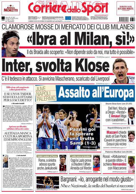 Il Corriere dello Sport parla di calciomercato con l’Inter che è pronta a prendere il centravanti del Bayern Monaco Miroslav Klose, rinunciando all’acquisto di Beppe Sculli. Klose è in rotta con l’allenatore del Bayern Van Gaal ed ha il contratto in scadenza, per questo l’Inter potrebbe acquistarlo con una piccola offerta.