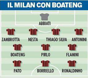 MILANO – Ieri il Milan ha ufficializzato l’arrivo di Kevin-Prince Boateng. Il centrocampista ghanese è arrivato in prestito dal Genoa che lo ha prelevato dal Portsmouth. Il Corriere dello Sport ha riportato la possibile formazione rossonera.