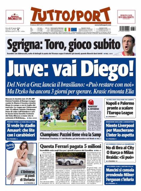 Sul quotidiano torinese Tuttosport si parla del calciomercato della Juventus ed in particolare della vicenda Diego, con il brasiliano che è stato confermato dal tecnico Delneri e quindi non sarà ceduto al Wolfsburg. Questa sera i bianconeri saranno impegnati nel match di Europa League contro lo Sturm Graz.