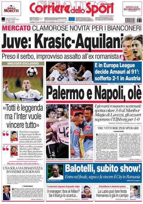 Anche il Corriere dello Sport concede ampio spazio alle manovre di calciomercato della Juventus che oltre all’acquisto dal Cska Mosca di Milos Krasic è vicina anche al centrocampista del Liverpool Alberto Aquilani.