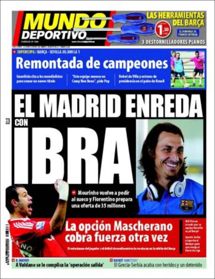 Anche il quotidiano catalano Mundo Deportivo è in vena di clamorose rivelazioni di mercato. Il Real Madrid starebbe preparando un’offerta di 35 milioni di euro per Zlatan Ibrahimovic, centravanti svedese del Real Madrid che piace a Mourinho.