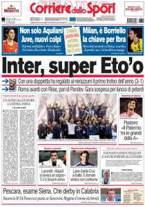 ROMA – Il Corriere dello Sport dedica la prima pagina nazionale all’attaccante camerunense Samuel Eto’o che ieri sera ha realizzato una doppietta nella finale di Supercoppa Italiana contro la Roma contribuendo alla conquista della quinta Supercoppa messa in bacheca nella storia dei neroazzurri. Gli altri gol sono stati siglati da Riise per i giallorossi e da Pandev per l’Inter.
