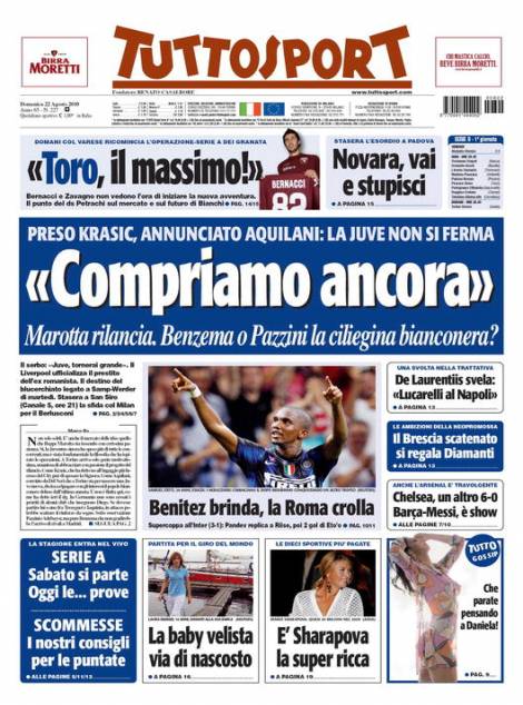 TORINO – Il quotidiano torinese non dedica la prima pagina alla vittoria dell’Inter ma bensì alla Juventus che sta mettendo a segno molti colpi di calciomercato importanti, ufficializzato Milos Krasic ed in arrivo Alberto Aquilani a Torino potrebbe arrivare anche un altro acquisto, che sarebbe la ciliegina sulla torta del mercato bianconer. I nomi in ballotaggio sono quelli di Karim Benzema o quello di Giampaolo Pazzini.