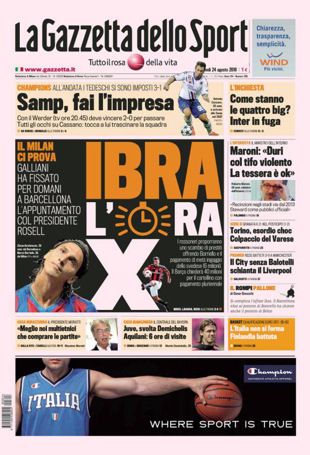 MILANO – La Gazzetta dello sport apre la prima pagina con la trattativa del momento. Galliani volerà domani a Barcellona per definire il passaggio di Ibrahimovic al Milan.