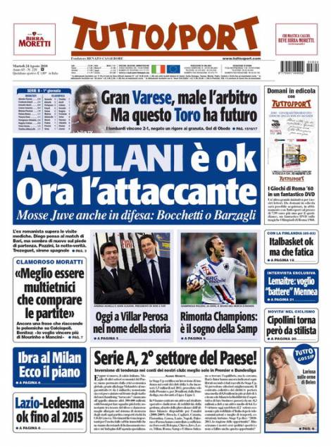 TORINO – Prima pagina dedicata alla Juventus. Aquilani ha superato tutti i severi test fisici ed ora Marotta pensa ad un nuovo centravanti per Delneri. Se la Sampdoria sarà eliminata questa sera, il nome giusto potrebbe essere Pazzini.