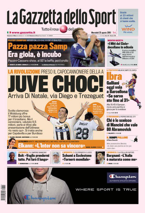 MILANO – Prima pagina dedicata alla trattativa clamorosa che sembrerebbe portare a Torino Di Natale. In serata sono arrivate le smentite, ma oggi dovrebbe esserci l’incontro decisivo.