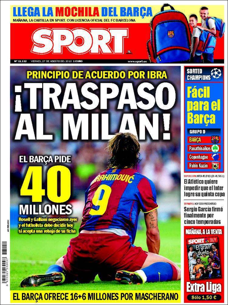 Sport/MADRID (Spagna) – Anche ‘Sport’ dedica la sua prima pagina di oggi all’imminente trasferimento di Ibrahimovic al Milan, rendendo note anche le cifre dell’accordo che dovrebbero basarsi su 40 milioni di euro.