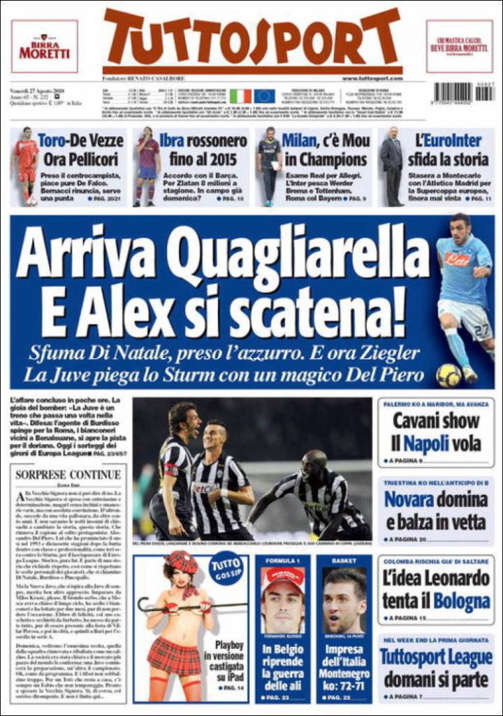 Tuttosport/TORINO – Il quotidiano sportivo torinese apre dando totale spazio alle ultime notizie legate alla Juventus, che in serata ha superato brillantemente lo Sturm, grazie ad un Alex Del Piero ispiratissimo e che ben presto avrà un concorrente in più per una maglia da titolare: Fabio Quagliarella.