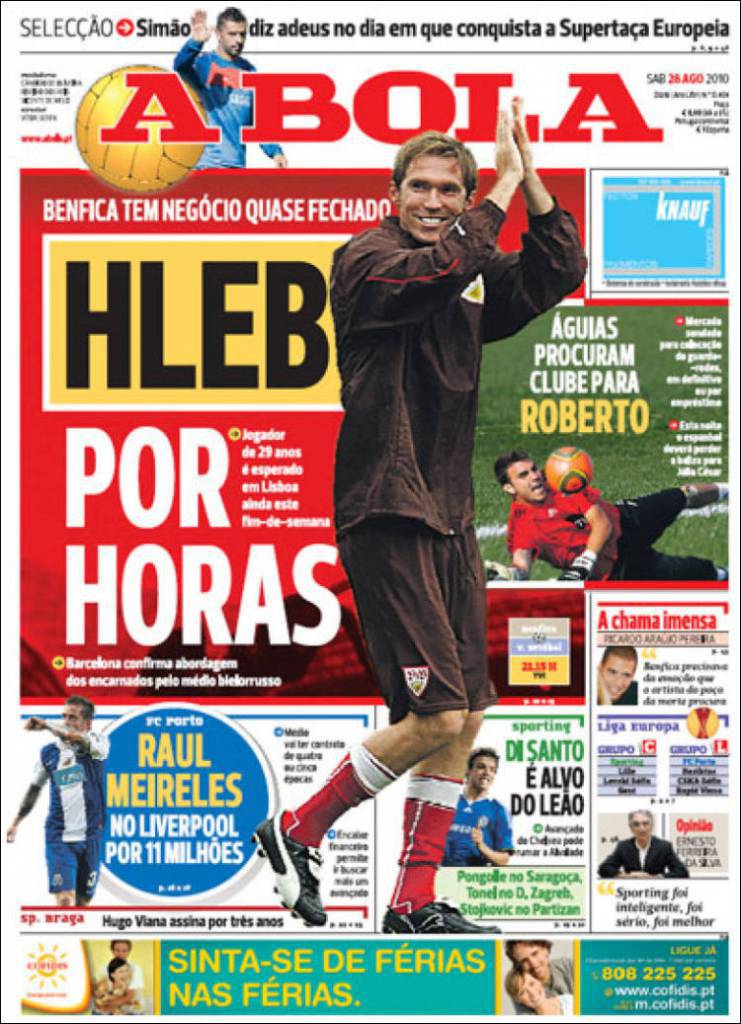 LISBONA (Portogallo) – Secondo quanto titola la prima pagina del quotidiano portoghese A Bola, il club lusitano del Benfica starebbe pensando di portare a Lisbona l’esterno bielorusso Aleksander Hleb attualmente in forza al Barcellona dopo una stagione in prestito allo Stoccarda. L’ex Arsenal non sta avendo fortuna nei blaugrana e potrebbe lasciare il Camp Nou per approdare nel club più titolato del Portogallo.