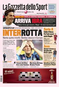 MILANO – Come riporta il titolo della prima pagina della Gazzetta dello Sport, è stata interrotta la striscia positiva di trofei dell’Inter, infatti ieri sera i neroazzurri hanno steccato contro l’Atletico Madrid. La squadra di Rafa Benitez ha perso per 2 a 0 a Montecarlo nella finale di Supercoppa Europea a causa dei gol di Josè Antonio Reyes e dell’argentino Sergio Aguero non riuscendo a mettere in bacheca il quinto trofeo di fila.