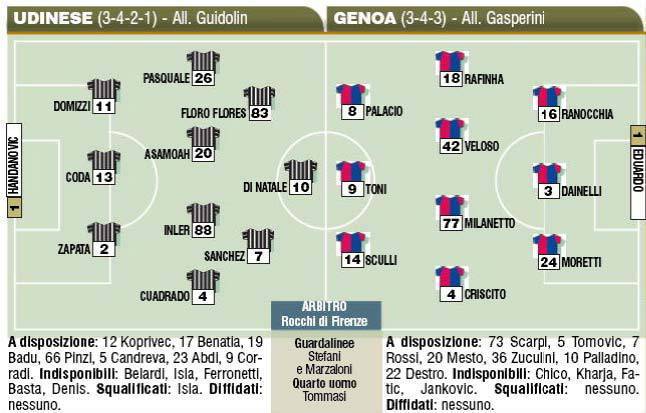 UDINE – Oggi ore 18:00 si parte con la Serie A e ritorna il grande calcio italiano che ci è mancato molto in quest’estate. Si parte con una partita molto interessante tra Udinese ed il Genoa, due squadre che giocano un gran calcio. Il Corriere dello Sport ha ipotizzato le probabili formazioni della partita e noi ve le riportiamo, ecco quindi i probabili 11 titolare della gara che darà inizio al campionato di Serie A 2010-2011!