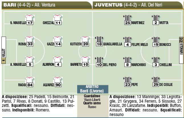 BARI – Oggi alle ore 18,00 allo stadio San Nicola di Bari esordirà anche la Juventus targata Gigi Del Neri. La nuova Juve, se così si può definire scenderà in campo con cinque acquisti di questa stagione vale a dire: Quagliarella, Martinez, Pepe, Bonucci e Storari. Il Bari tuttavia non si farà intimorire e si prospetta il pubblico delle grandi occasioni a spingere la propria squadra, ecco le probabili formazioni prese dal Corriere dello Sport.