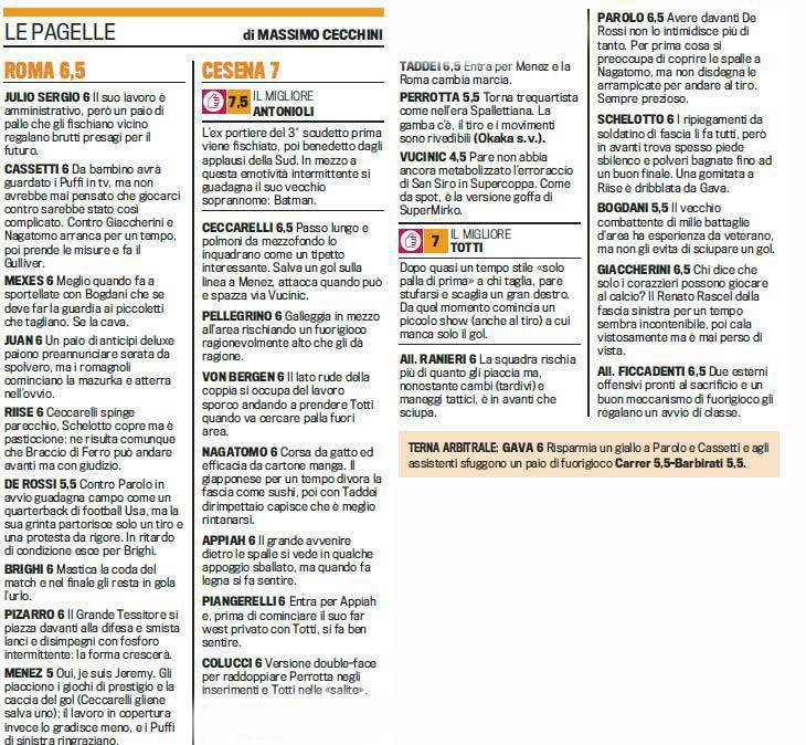 ROMA – Dopo il 3 a 1 della Supercoppa, inizia male il cammino della Roma in campionato, che pareggia per 0 a 0 contro il Cesena. Ecco le pagelle della Gazzetta: