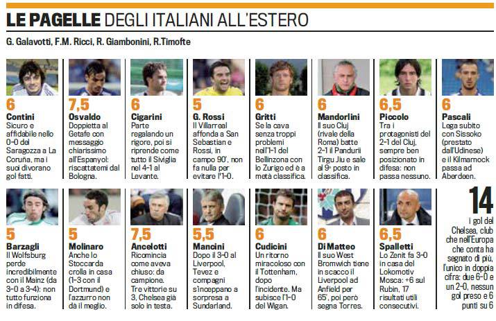 Calcio/MILANO – Nell’edizione odierna della ‘Gazzetta dello Sport’, il giornale milanese ci propone le pagelle dei calciatori e allenatori italiani impegnati nei campionati esteri. Molto bene Carlo Ancelotti in Premier League e Luciano Spalletti nel campionato russo. Tra i giocatori, spicca l’ottimo voto di Osvaldo dopo la sua doppietta rifilata al Getafe.