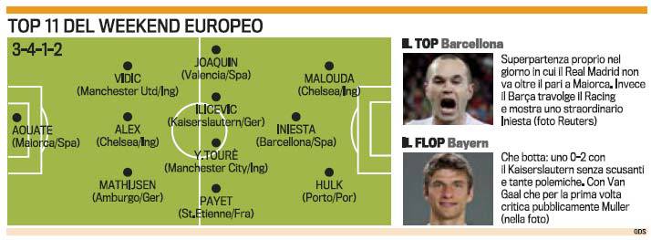 Calcio/MILANO – Anche questa settimana, la ‘Gazzetta dello Sport’ ci propone la formazione ideale dei migliori giocatori d’Europa di questa settimana. Quasi immancabile, Iniesta, in odore di ‘Pallone D’Oro’ è a supporto di un attacco stellare con Malouda e il gigante del Porto, Hulk.