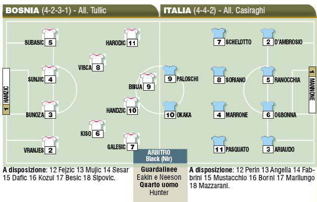SARAJEVO (Bosnia) – Questo pomeriggio, alle 17, l’Under 21 di Casiraghi affronterà la Bosnia per cercare la qualificazione ai prossimi Europei di categoria. Il c.t. italiano punterà sulla coppia Okaka-Paloschi in attacco, mentre Ranocchia guiderà la difesa. Ecco le formazioni riprese dal Corriere dello Sport.