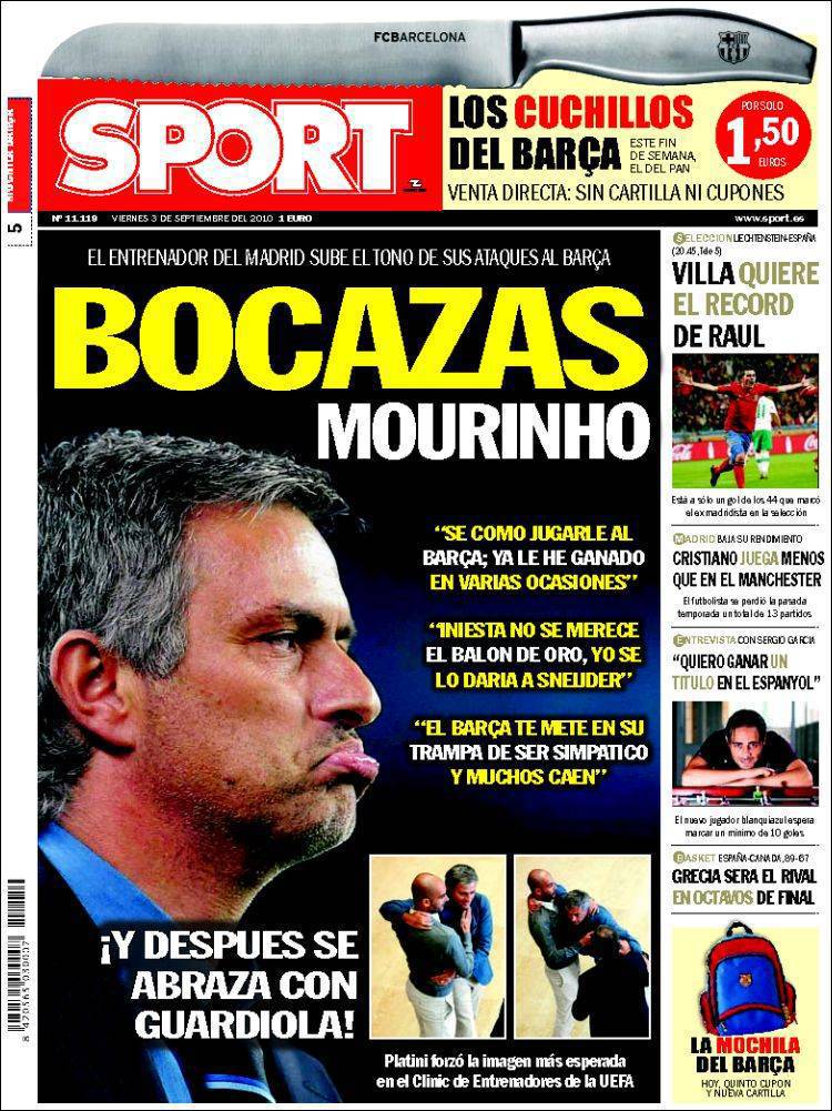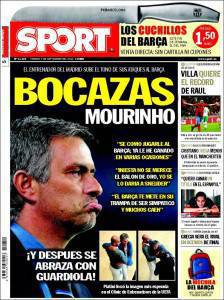Sull’altro quotidiano catalano Sport si parla sempre dello Special One Josè Mourinho, tecnico del Real Madrid, che continua a mandare frecciate al Barcellona. Nel riquadro in basso la sequenza dell’abbraccio tra Mourinho e Guardiola, tecnico dei catalani.