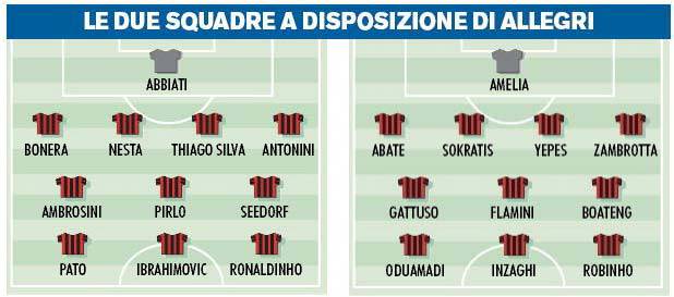 Calciomercato Milan – MILANO – Il calciomercato estivo del Milan ha regalato a Massimiliano Allegri, allenatore dei rossoneri, due squadre di altissimo livello. Se infatti gli 11 titolari possono competere con qualsiasi formazione italiana ed europea non va dimenticato l’11 riserve, composto da gente del calibro di Robinho, Flamini, Sokratis, Amelia e via dicendo. In via Turati tornano finalmente ad avere una lunga panchina, un elemento in più in favore della rincorsa alla Champions League e allo Scudetto. Di seguito la foto dei due Milan pubblicata dal Corriere dello Sport.