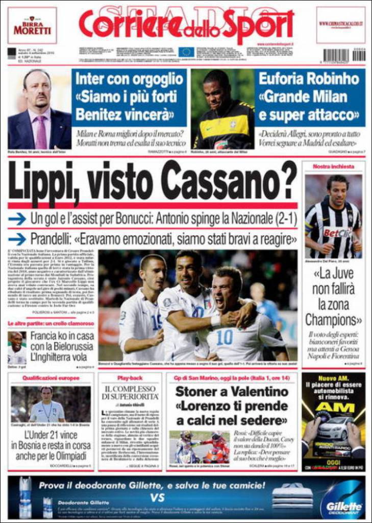ROMA – Il Corriere dello Sport celebra la vittoria dell’Italia sull’Estonia mandando una frecciatina a Marcello Lippi. Il quotidiano romano sottolinea infatti la grande prestazione di Antonio Cassano, per lui una rete e un assist, giocatore completamente ignorato dall’ex ct viareggino.