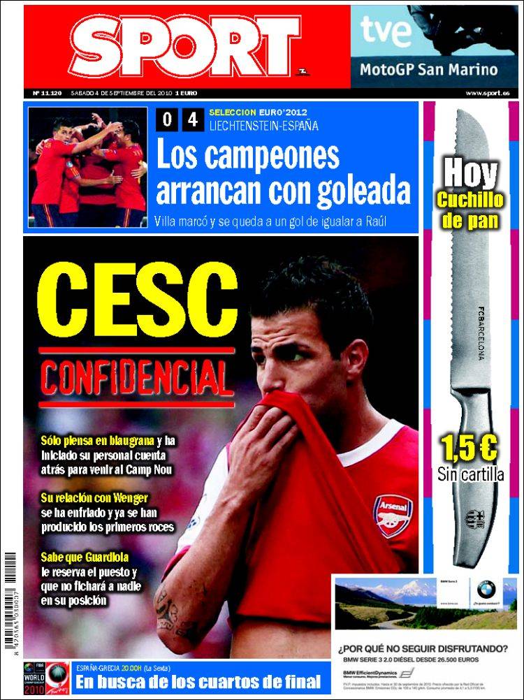 BARCELLONA (Spagna) – Sport, noto quotidiano catalano, dedica la prima pagina a Cesc Fabregas. Il gioiello spagnolo, che quest’anno ha deciso di rimanere a Londra, avrebbe la mente a Barcellona e a partire dalla prossima estate il tanto atteso trasferimento dovrebbe concretizzarsi.