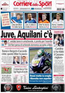 ROMA – Alberto Aquilani c’è, come titola e conferma la prima pagina del Corriere dello Sport, il centrocampista romano attualmente in prestito alla Juventus con diritto di riscatto dal Liverpool sembra essersi ripreso dopo un periodo non molto brillante. Inoltre sempre secondo il quotidiano il giocatore potrebbe partite titolare nella prossima partita della Juventus di campionato affiancato da Felipe Melo.