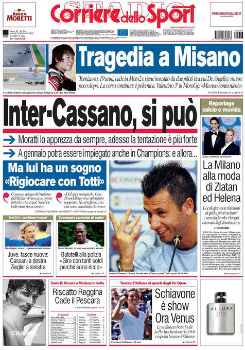 Sul Corriere dello Sport si parla del possibile arrivo a Milano, sponda Inter, di Antonio Cassano. Il gioiello barese della Sampdoria piace da tempo al presidente nerazzurro Massimo Moratti, in più a gennaio il giocatore potrebbe essere impiegato in Champions League.