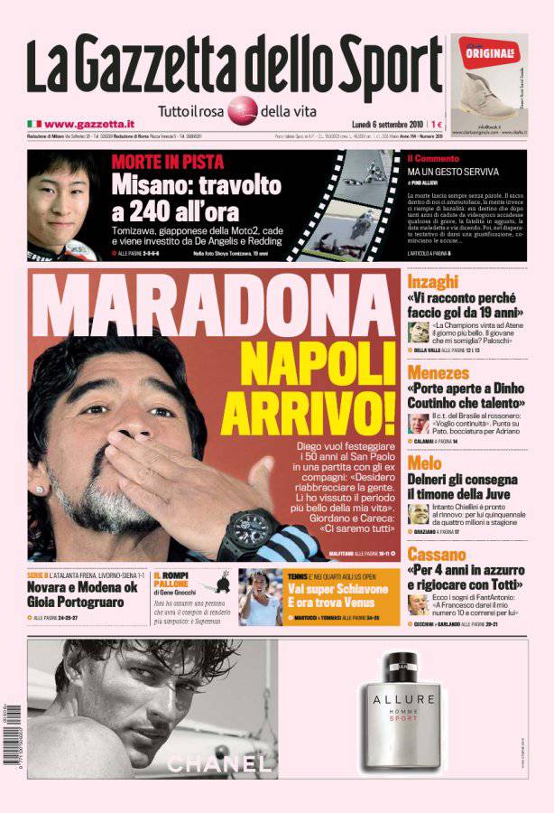 Sulla Gazzetta dello Sport si parla di Diego Armando Maradona, ex c.t. dell’Argentina ed ex grande calciatore del Napoli che per i suoi 50 anni ha deciso di giocare al San Paolo un match con tutti i suoi ex compagni. Un avvenimento che ha già elettrizzato la città campana.
